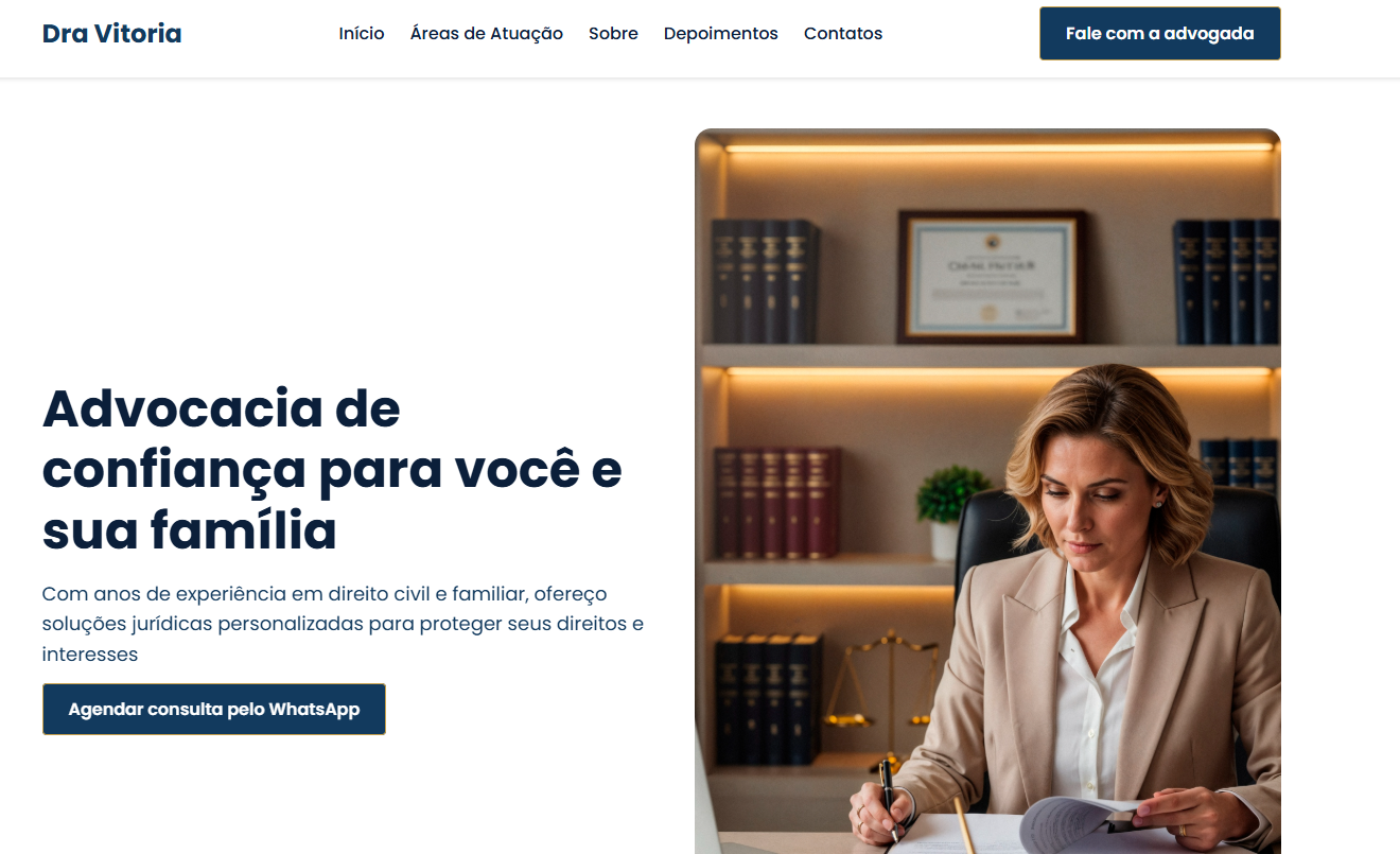 Landing page institucional para escritório de advocacia, desenvolvida com foco em conversão, clareza de informações e credibilidade. O projeto apresenta layout profissional, design responsivo, seções estratégicas de serviços e chamada para contato direto.